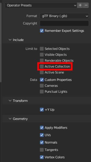Active Collection is only needed if there's part of the level you don't want to export as explained in the previous point. Since I've deleted the part I do not wish to export, I don't need to have this selected.