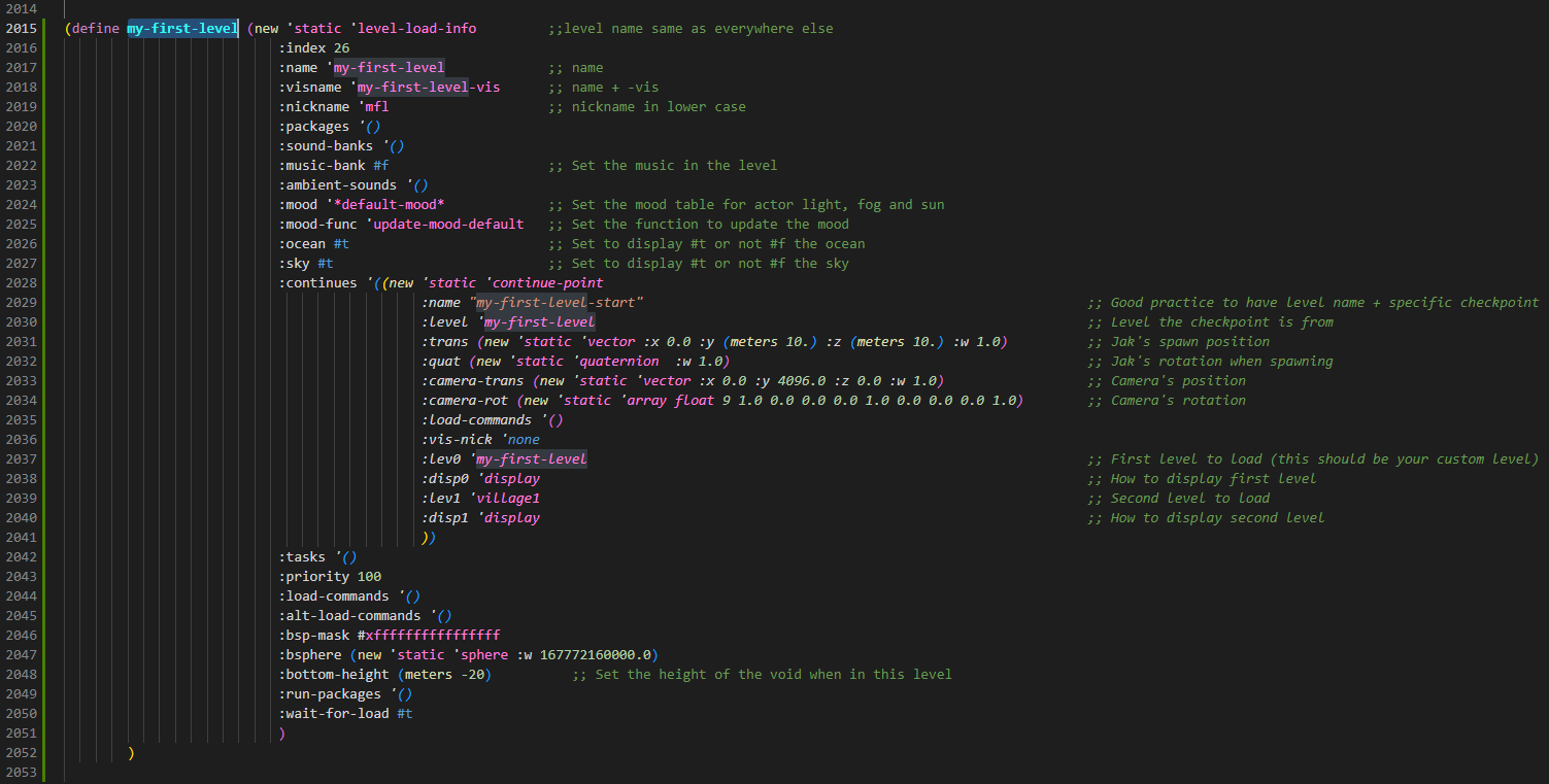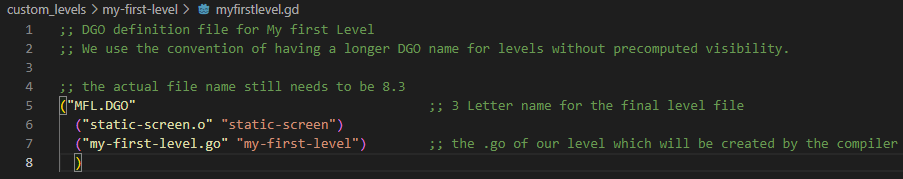 The .gd file, myfirstlevel.gd in my situation, will create the definition for our DGO file, AKA our full level file. In short, we'll have to put everything that needs to be included inside of our level here.