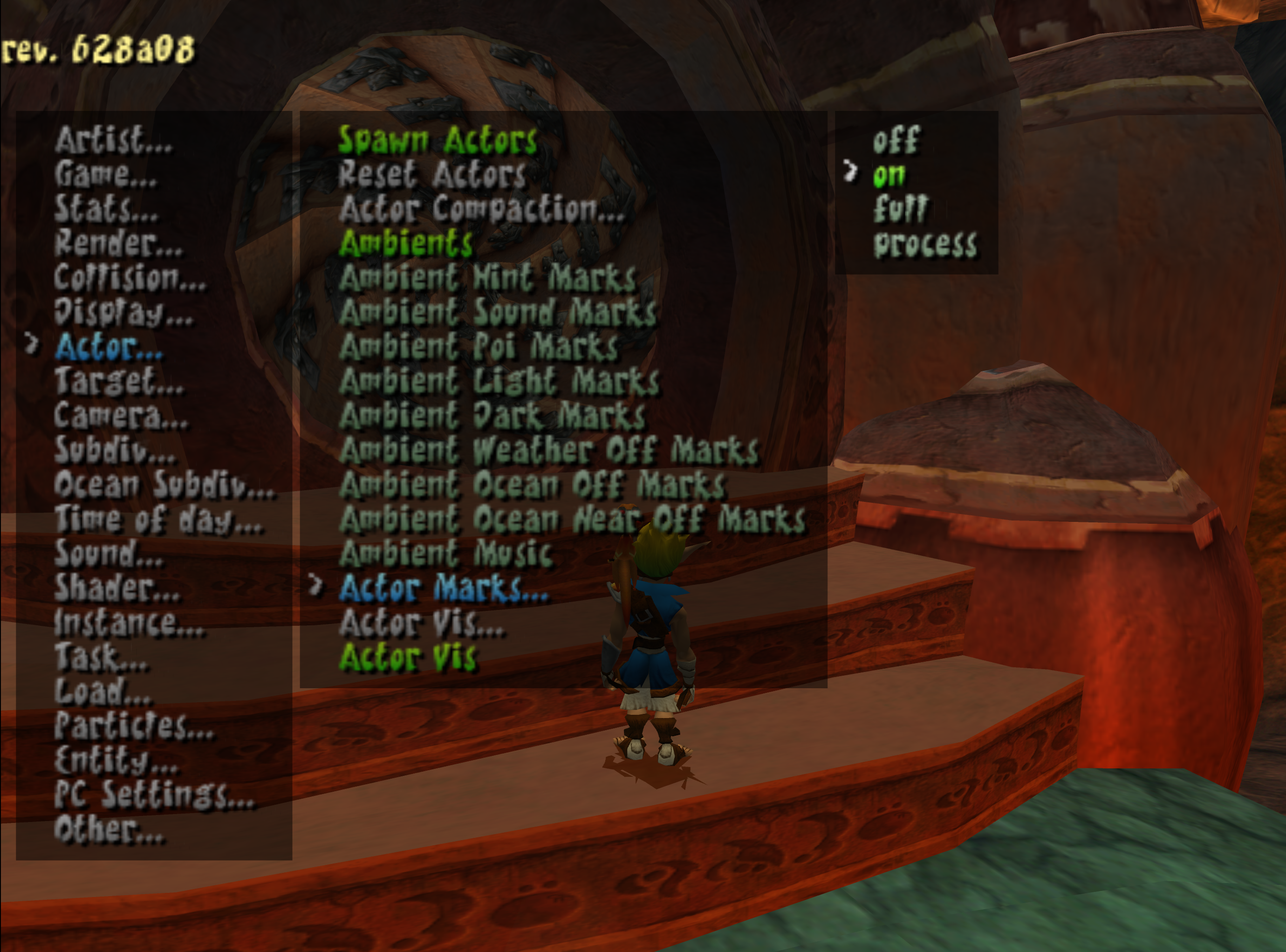 The param3 field of each option dictates which submenu should be loaded in if the option is selected, based on the mappings in *options-remap*. For instance, the first option game-settings is mapped to a submenu *game-options-pc* here. Note that the game-option-menu enum is just a copy of progress-screen.