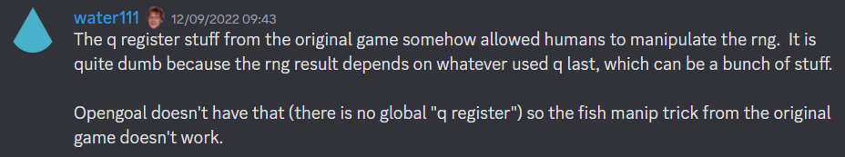 Alright so now we know how to warp to a particular continue-point, let's work on randomizing where we warp to. Let's assume you didn't know anything about RNG implementation in OpenGOAL - one way to figure out how RNG works is to pick something in the game that you know relies on RNG, and read through the related code. A nice isolated candidate for this is the fishing game in Forbidden Jungle, which uses RNG to determine the fish types and patterns.