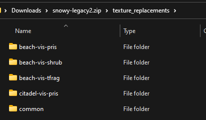 .zipfile with a top levelcustom_assets/<jak1|jak2|jak3|jakx>/texture_replacementsfolder. This folder should contain all of your texture replacements in the same layout they would be while creating the pack. For example:
