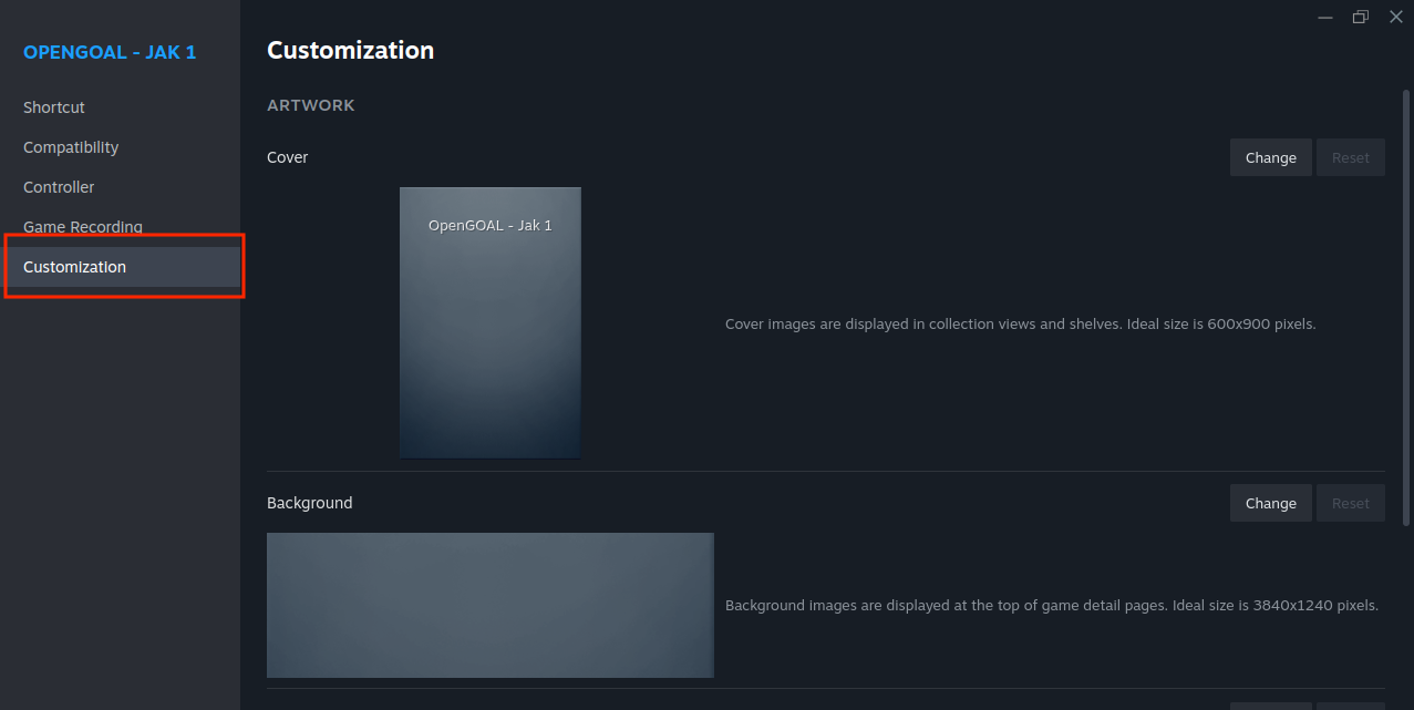If you want to customize the look of the game's shortcut (the cover-art, thumbnail, etc) you can do so via the Customize menu: