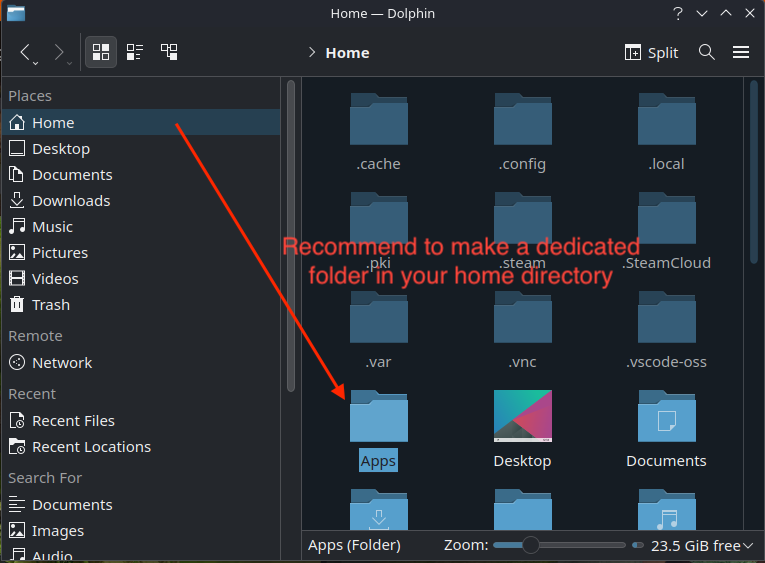 First after downloading it, you should move it to a directory in your HOME directory so it is not lost between SteamOS updates. Here I've created an Apps folder, and cut and pasted the file there.